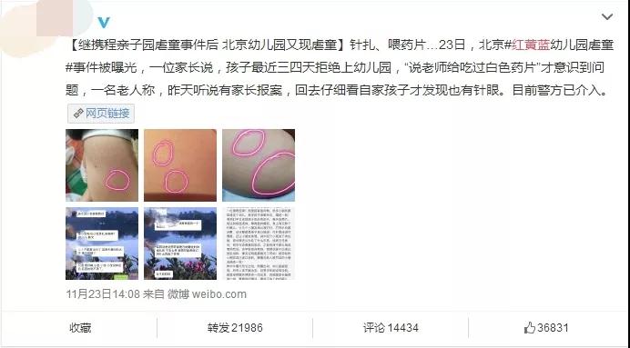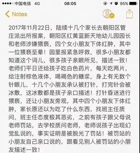 据有关消息,北京朝阳区红黄蓝幼儿园被曝出群体猥亵幼儿,出现给孩子喂不明白色药片,喝褐色糖浆、脱光衣服体罚等虐待儿童行为。