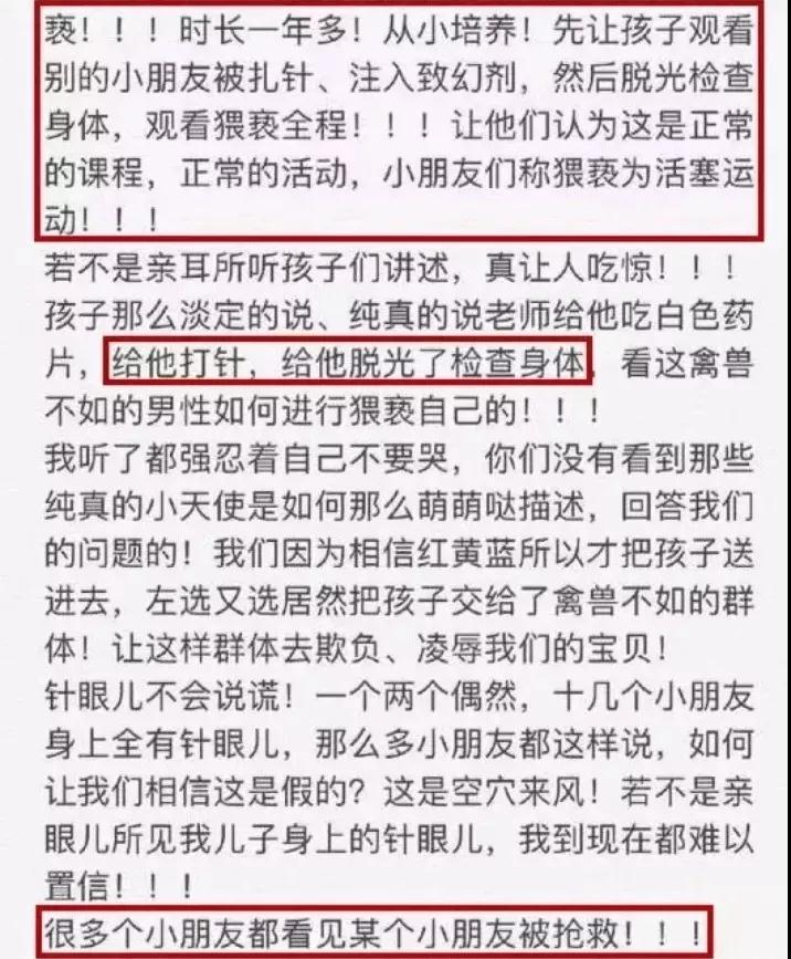 从上述的图片中,我们可以整理出来,这并不是一场个别教师心理扭曲的变态虐童行为,而是一场有组织、有规模、有目的群体虐童行为!