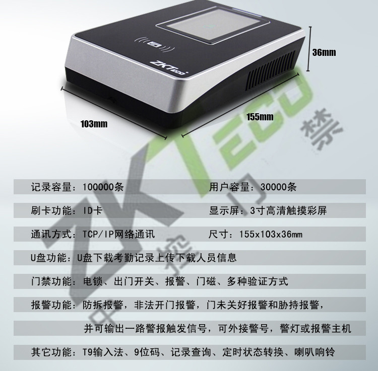报警功能:防拆报警,非法开门报警,门未关好报警和胁持报警,并可输出一路警报触发信号,可外接警号,警灯或报警主机